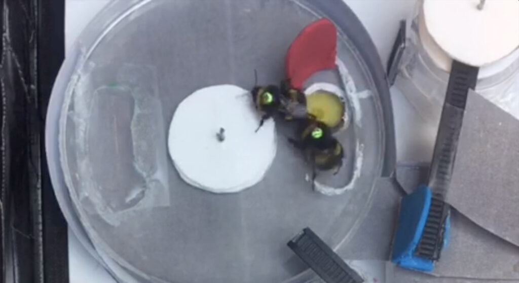 Toujours pour continuer de vous convaincre que les insectes ne sont pas de petits automates dénués d’intelligence, il y a ce travail incroyable sur le jeu. Des chercheurs ont mis à proximité de colonies de bourdons des petites balles en bois. Et rapidement, ils ont observé que certains bourdons montaient dessus et les faisaient rouler. Juste pour le plaisir. Je vous passe les détails mais ils ont démontré que ce comportement remplit tous les critères du jeu : pas de rétribution, pas de fonction immédiate, une activité intrinsèquement agréable, qui se répète lorsque les conditions s’y prêtent. Et autre éléments comique, les jeunes bourdons jouent davantage que les plus âgés, et les mâles s’attardent plus longtemps sur une balle que les femelles. Des patterns bien connus chez les mammifères, et donc chez les humains. On a même montré que si les balles étaient placées dans une boite bleue, et bien cette couleur bleue allaient être plus attractives pour les bourdons, comme si le jeu leur manquait et qu’ils associaient à présent cette couleur et leur “salle de jeu”, à une forme de plaisir.