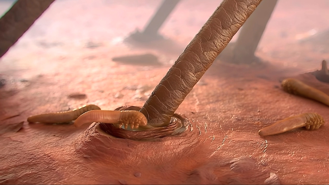 Les Demodex ne sont pas des insectes, mais de minuscules acariens, un peu comme ceux que l’on retrouve dans nos matelas. Sauf qu’eux préfèrent notre peau à notre lit. Et tous les adultes en ont ! Au point qu’ils figurent dans la liste des parasites les plus fréquents des humains.