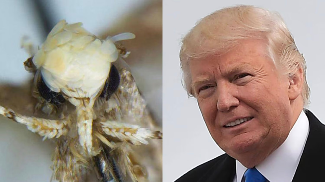 Autre exemple : un papillon a été nommé Neopalpa donaldtrumpi. Le biologiste canadien qui l’a ainsi nommé a déclaré avoir choisi le nom de donaldtrumpi en référence à la similitude entre la coiffure de Donald Trump et celle du papillon, le premier arbore une longue mèche jaunâtre sur la tête, et le second … aussi. Et il a aussi confié qu’en lui donnant un nom pareil, il espérait attirer l’attention des médias sur l’importance de protéger les habitats fragiles contenant encore des espèces inconnues.