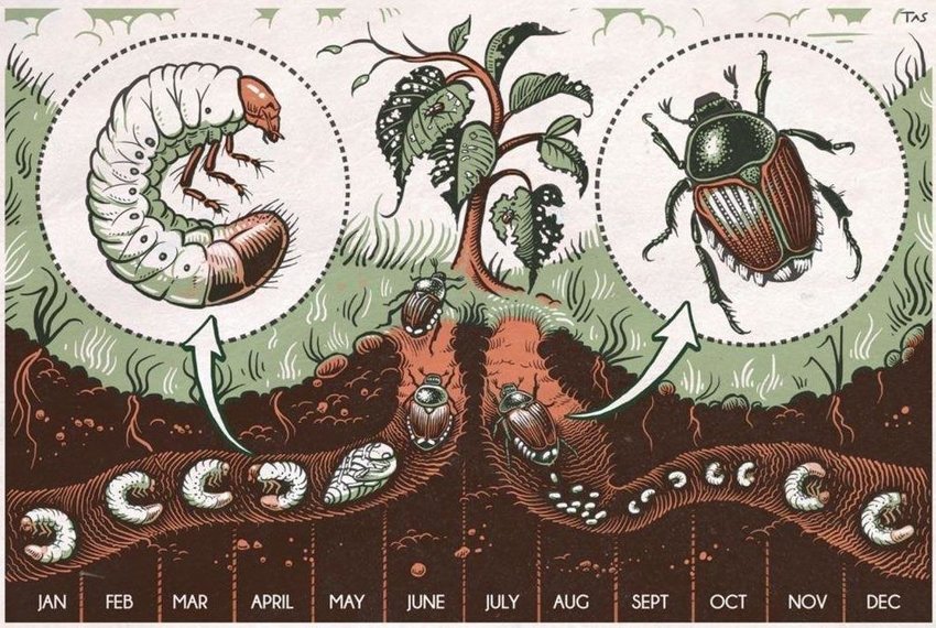 Le fait de se métamorphoser complètement permet à l’insecte de vivre deux périodes très contrastées, avec des lieux de vie et des habitudes complètement différentes. Ainsi les larves évoluent à quelques centimètres de profondeur dans le sol. Elles y dévorent les racines de plantes. Une fois adulte, elles vivent en surface et se posent sur les tiges et feuilles qu’elles dévorent alors. Et l’un des problèmes les plus important lié à cet insecte, c’est qu’il a un énorme appétit. En mangeant les racines, les larves empêchent la plante de prélèvement dans le sol l’eau et les nutriments dont elle a besoin. Rapidement en surface, elle s’assèche, on l’impression qu’elle a juste soif, alors que le problème vient de ses racines, maltraitées. Une fois sorti de terre, les adultes laissent une marque beaucoup plus claire de leur présence. Ils mangent les feuilles en laissant soigneusement de côté les nervures, ce qui résulte en un aspect typique de feuille en dentelle.