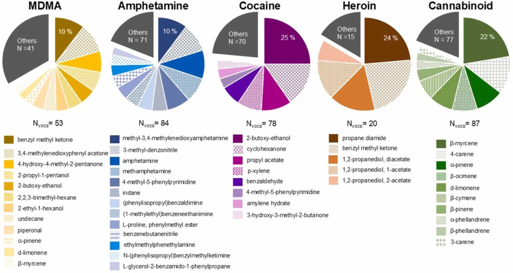 Le profil olfactif de la cocaïne raconte une tout autre histoire. Ici, pas de terpènes végétaux, mais un cocktail de cétones, d’esters et de composés aromatiques. D’où viennent-ils ? En grande partie du processus d’extraction lui-même. Lorsque la cocaïne est extraite des feuilles de coca, des solvants sont utilisés, et ces solvants laissent des traces volatiles dans le produit final. Par exemple, l’acétate de propyle, l’un des composés les plus abondants que nous avons détectés, est un résidu typique du processus de fabrication colombien.