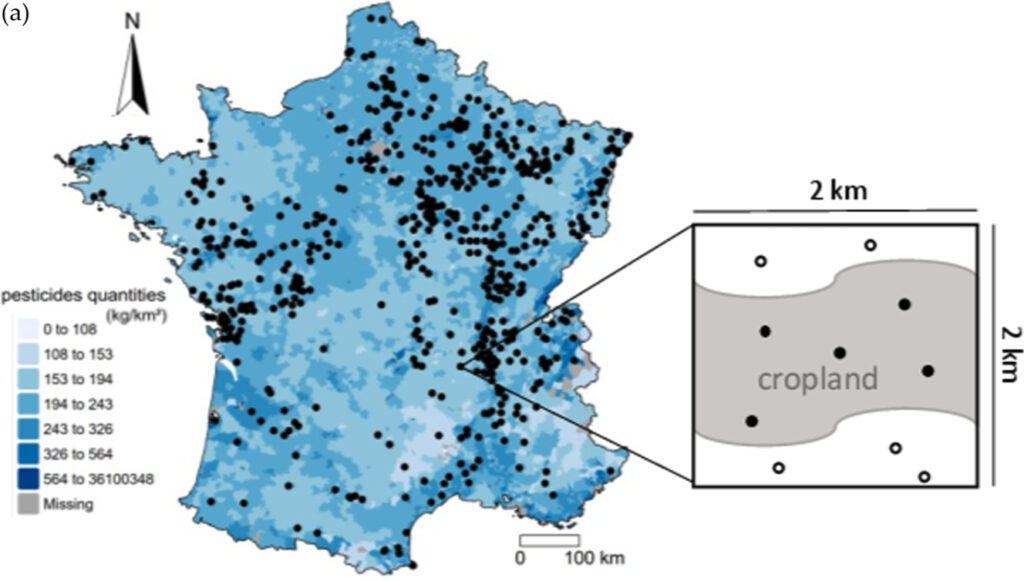 🚜 Et ce n’est pas qu’une question de paysage agricole intensif : même en tenant compte de la taille des parcelles, de l’usage d’engrais ou de la proportion de prairies, l’effet des pesticides reste bien visible.