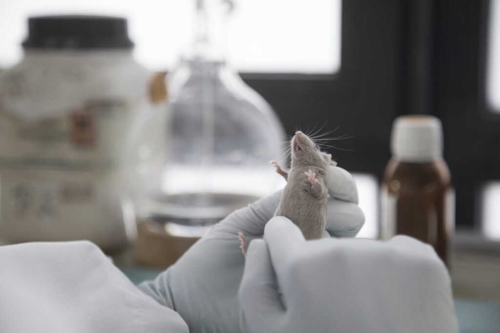 Germany, Research laboratory, Young scientist holding laboratory mouse after treatment